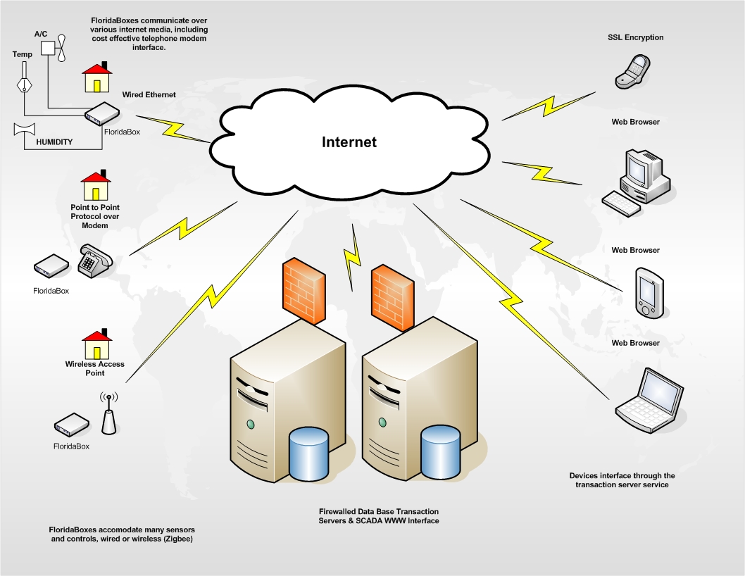 (snow bird) Florida homeowner/engineer who spends little time at his vacation property over 1400 miles away. He needs to be able to remotely monitor and control certain functions in his home without the need for a bulky PC which can be extremely unreliable in an extremely humid environment and shaky power infrastructure given recent weather events (i.e. hurricanes). The floridaBox is economical, expandable and reliable. It can take advantage of all means of connectivity to the Internet, namely broadband and dialup. It usually is mounted